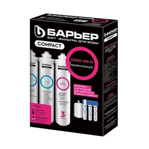 Комплект фильтроэлементов для обратноосмотического фильтра БАРЬЕР Compact OSMO 100 М. Устанавливается в качестве 1-3 ступеней. Не требует специальных инструментов для замены. В комплект входит: "БАРЬЕР Compact Поликарбон" – одновременная механическая и собционная очистка, "БАРЬЕР Compact RO 100" – обратноосмотическая мембрана 100 галлон. "БАРЬЕР Compact Карбоминерал» – обогащает воду магнием, кальцием и кремнием. Ресурс комплекта фильтроэлементов – 5 000 литров. Частота замены 1 и 3 ступеней до 6 месяцев, 2ой ступени – мембраны – до 18 месяцев.