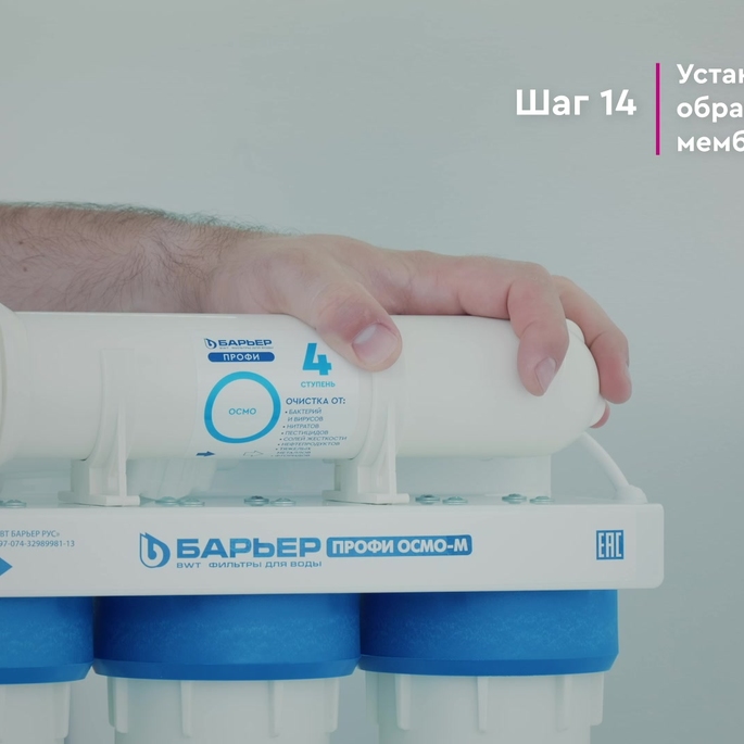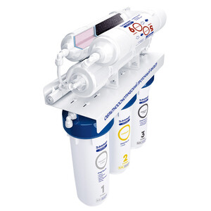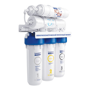 Водоочиститель в сборе 1 шт; Пластиковый ключ для замены фильтроэлементов предварительной очистки 1 шт; Сменный модуль обратноосмотической мембраны 1 шт; Накопительная емкость 1 шт; Кран накопительной емкости 1 шт; Шаровой вентиль для подключения к водопроводу 1 шт; Кран для чистой воды с прокладками, шайбами, гайкой и фитингом 1 шт; Дренажный хомут 1 шт; Соединительные пластиковые трубки: cиняя 1,5 м, черная 1,5 м, красная 1,5 м, белая 1,5 м; угловой фитинг 1 шт, вильчатый пластиковый ключ для замены мембраны и постфильтр 1 шт; руководство по эксплуатации 1 шт.